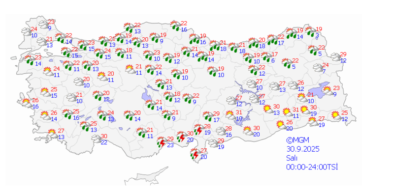 Meteoroloji Genel Müdürlüğü’nün son değerlendirmelerine göre Ankara’da 30 Eylül Salı günü parçalı ve çok bulutlu bir hava bekleniyor. Gün boyunca sıcaklık 22°C civarında seyredecek. Öğle ve akşam saatlerinde başkentin farklı bölgelerinde yerel sağanak yağış ve gök gürültülü sağanak etkili olacak. Özellikle Ankara’nın güney ilçelerinde yağışların akşam saatlerinde yer yer kuvvetli olacağı tahmin ediliyor.