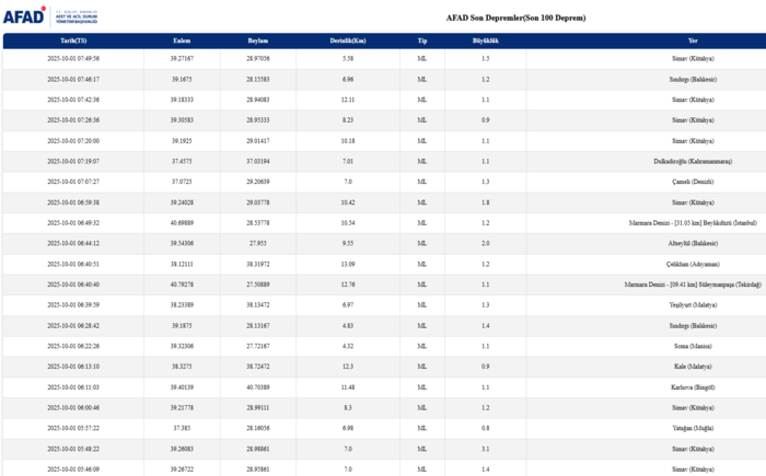 Kandilli Rasathanesi ve AFAD’ın resmi internet sitelerinde, yaşanan son depremlerin büyüklüğü, derinliği, saati ve merkezüssü ölçülerek kaydedilmektedir