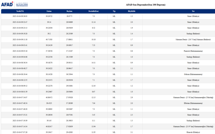 Kandilli Rasathanesi ve AFAD’ın resmi internet sitelerinde, yaşanan son depremlerin büyüklüğü, derinliği, saati ve merkezüssü ölçülerek kaydedilmektedir