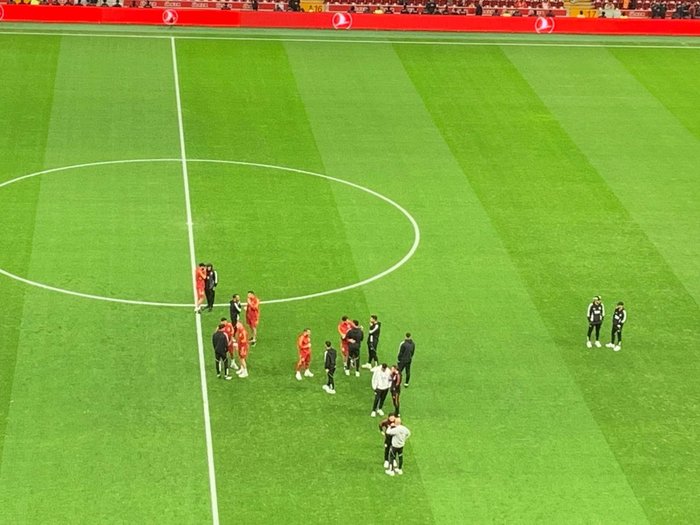 RAMS Park’ta zemini incelemek üzere sahaya çıkan iki takımın futbolcuları dev derbi öncesi sohbet etti.
