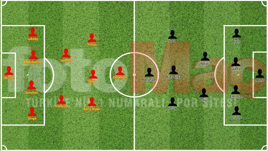 Galatasaray: Uğurcan, Singo, Sanchez, Abdülkerim, Jakobs, Torreira, İlkay (Sane), Lemina, Barış Alper, Yunus, Osimhen (Icardi)