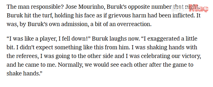 Buruk, Mourinho ile yaşadığı gergin anı da şöyle anlattı: “Bir oyuncu gibiydim, yere düştüm ve biraz abarttım. Ondan böyle bir şey beklemiyordum. Hakemlerle tokalaşıyordum, zaferimizi kutluyordum, o yanıma geldi. Normalde maçtan sonra tokalaşırdık ama farklı bir sahne yaşandı.”