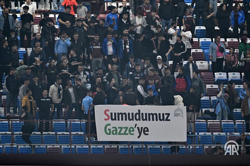 Ayrıca bordo-mavili taraftarlar açtıkları pankartlarda “Gazze’de hayat var, vicdanlarda sızı” ve “S’umudumuz Gazze’ye” ifadelerine yer verdiler.