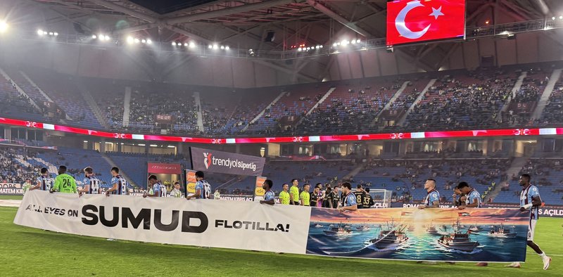 Trabzonspor’da futbolcular öncelikle sahaya “Tüm gözler Sumud Filosu’nda” yazılı pankart ile sahaya çıktılar.