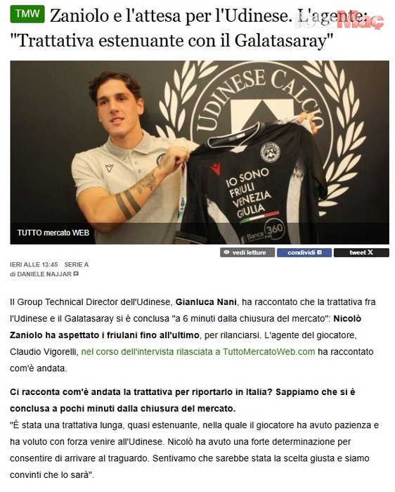 Galatasaray’dan kiralık olarak Udinese’nin yolunu tutan Nicolo Zaniolo için menajerinden açıklama geldi. İtalyan temsilci, Udinese ile Galatasaray arasındaki transfer görüşmelerinin detaylarını Tutto Mercato’ya verdiği röportajla aktardı.